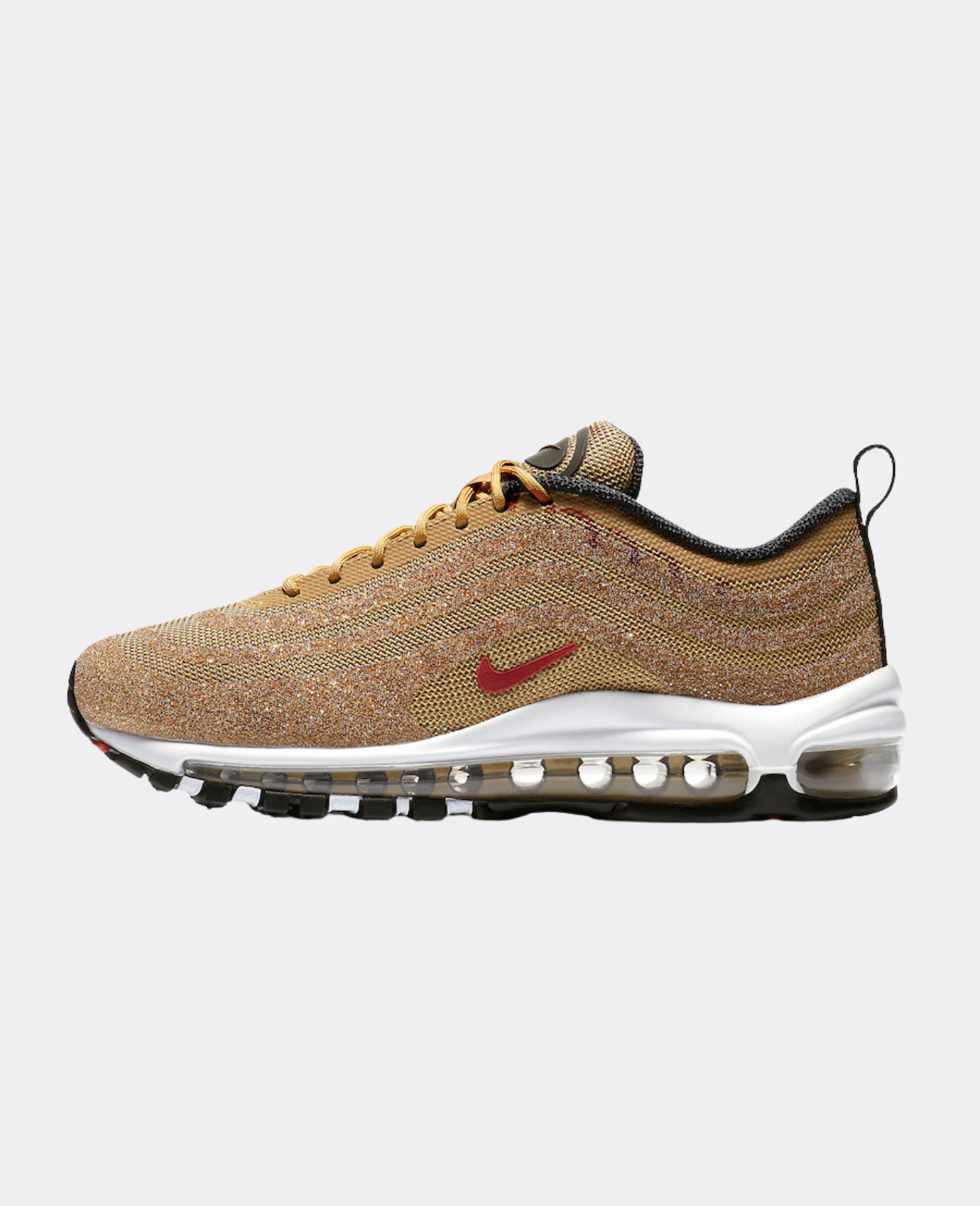The Air Max 97 Swarovski Gold sneakers bring together luxury shine and iconic sporty design for a truly standout look. Featuring a radiant gold-toned upper with crystal-style detailing, this silhouette catches the light from every angle while maintaining a sleek, wave-inspired profile. The visible air cushioning delivers lasting comfort, making these perfect for both statement style and everyday wear.
