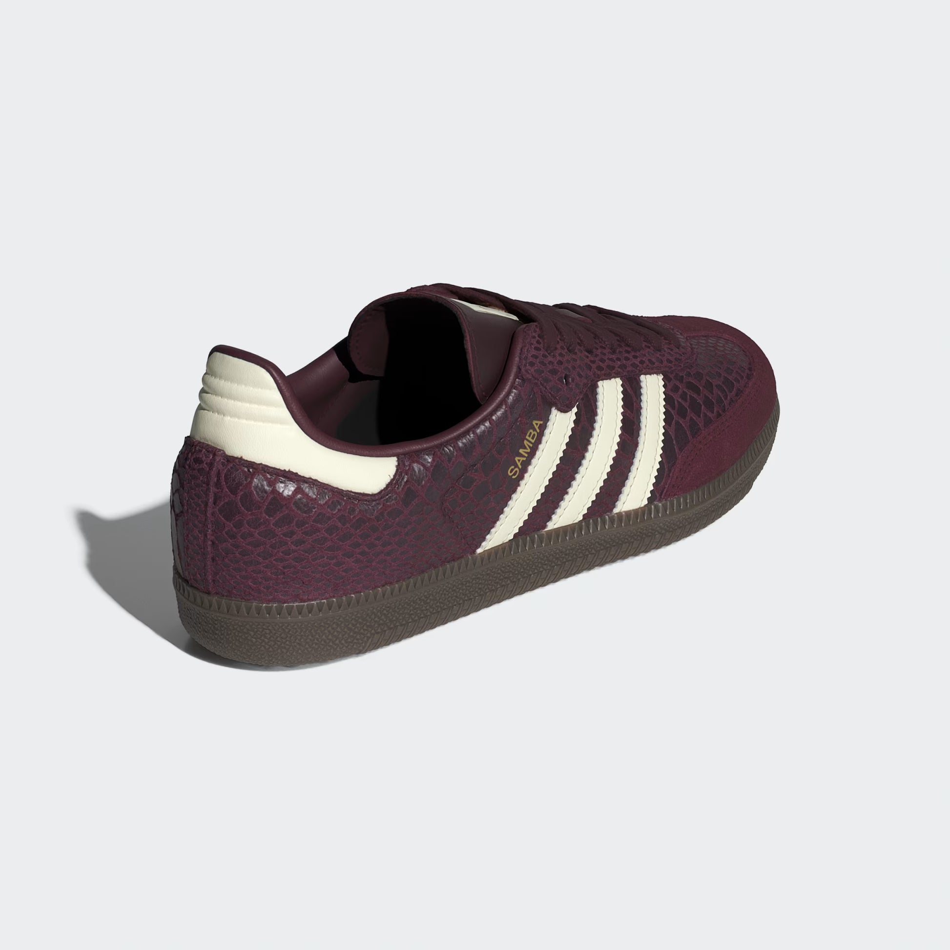 The Samba OG Snakeskin Maroon Cream elevates a timeless classic with rich, eye-catching textures and warm tones. Featuring a maroon and cream snakeskin-patterned upper with premium details, this silhouette delivers standout style with a refined edge. Comfortable and versatile, it’s perfect for everyday wear or adding a bold touch to your outfit — a stylish mix of heritage charm and modern flair.